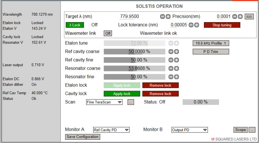 TeraScan包含一個(gè)自動(dòng)波長(zhǎng)調(diào)諧和鎖定的功能。SolsTIS將迅速調(diào)到調(diào)諧范圍內(nèi)的任何波長(zhǎng)。當(dāng)目標(biāo)波長(zhǎng)被達(dá)到,SolsTIS可以鎖定波長(zhǎng)計(jì)。絕對(duì)精度和漂移/穩(wěn)定由波長(zhǎng)計(jì)來(lái)確定。