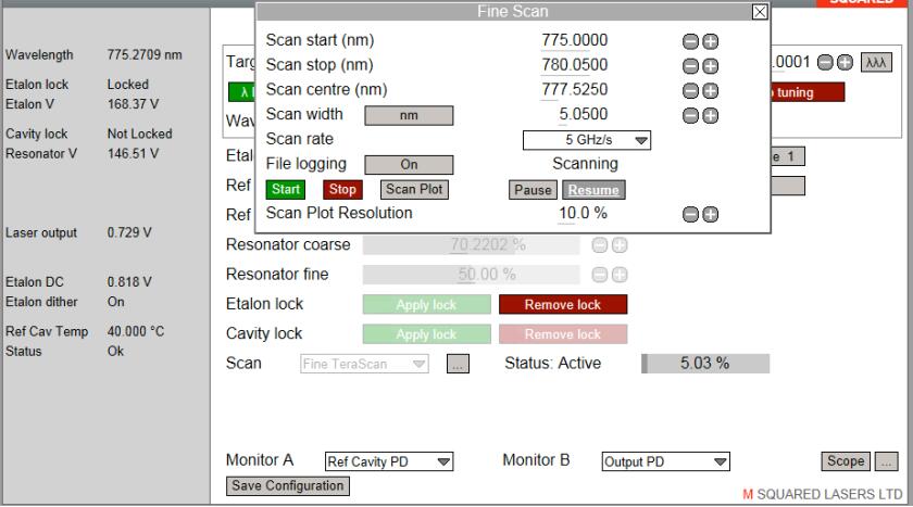 通過(guò)鎖定激光到可選可調(diào)的參考腔,線寬度通常在100kHz的高精度掃描被形成。波長(zhǎng)掃描間隔比精細(xì)掃描更小。掃描速率在諧振腔段可設(shè)置為20GHz/s到50kHz/s, 段間縫發(fā)生大約為20GHz.