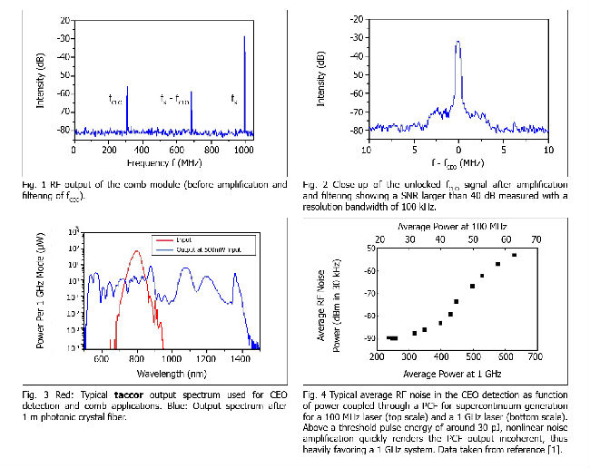 Taccor Comb是英國Laser Quantum公司開發(fā)的一套基于1GHz重復(fù)頻率飛秒激光器完整的光學(xué)頻率梳系統(tǒng),包括全自動1GHz藍(lán)寶石飛秒激光器Taccor,色散補(bǔ)償模塊,超連續(xù)發(fā)生器,非線性f-to-2f自干涉系統(tǒng),穩(wěn)頻系統(tǒng)TL1000等。Taccor Comb光學(xué)頻率梳系統(tǒng)頻率間距1GHz,fCEO拍頻信號噪比大于40dB(300KHz RBW),穩(wěn)定性3x10-13,精度等于參考信號精度,在客戶實(shí)驗(yàn)室得到10-19!一個(gè)可選的超連續(xù)譜產(chǎn)生模塊可在520nm和1200nm之間創(chuàng)建穩(wěn)定的梳狀光。