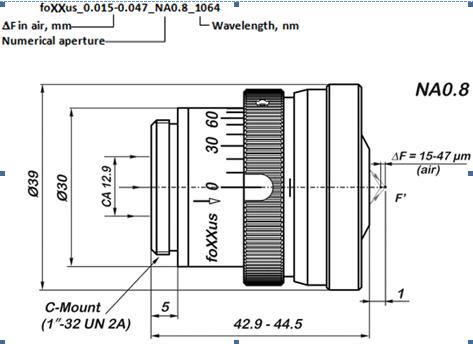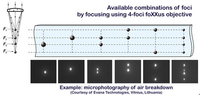 具有專利設(shè)計的能產(chǎn)生多焦點(diǎn)的物鏡。foXXus物鏡可以在一條光軸上產(chǎn)生1,2或者4個焦點(diǎn)。其中0.015-0.047表示在空氣中的DF(mm),NA0.8代表數(shù)值孔徑。材料內(nèi)部裂紋通常比光學(xué)設(shè)計中定義的DF更長。