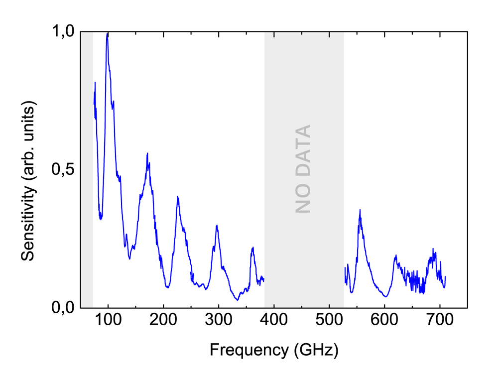 TeraSense® 探測器在很寬的頻率范圍內(nèi)都很靈敏。然而,它們的頻率響應(yīng)不是連續(xù)的,而是由多個(gè)頻帶(峰值結(jié)構(gòu))組成。響應(yīng)曲線上峰值的位置可以在制造階段進(jìn)行調(diào)整,以滿足特定客戶的要求。